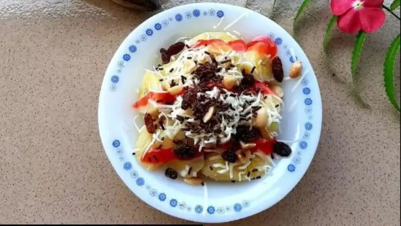 - Tambahkan topping kacang tanah, kismis, dan meses. Pisang Kukus Aneka Topping siap disajikan.